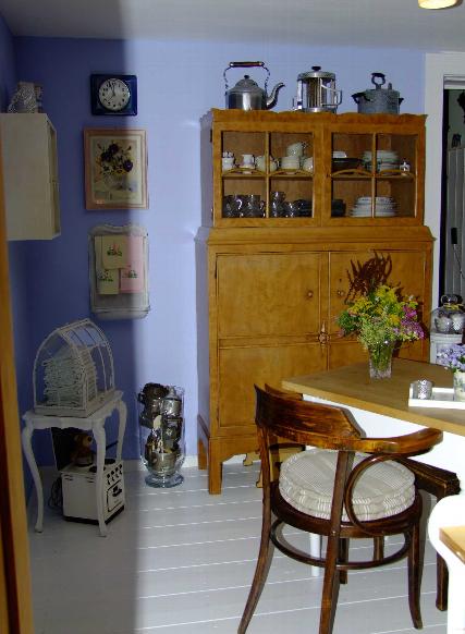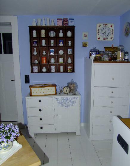 Oben: Frühstücksecke. Das Setzkasten-Regal bekommt noch einen Shabby-Anstrich.