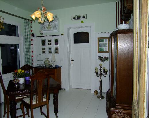 Unten: Esszimmer. Tisch und Stühle werden noch Shabby-weiß gestrichen, ebenso die Kommode.